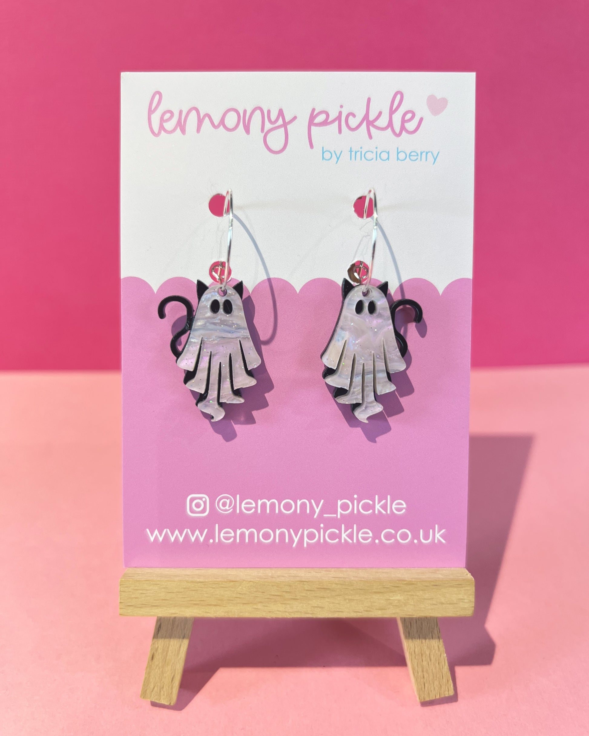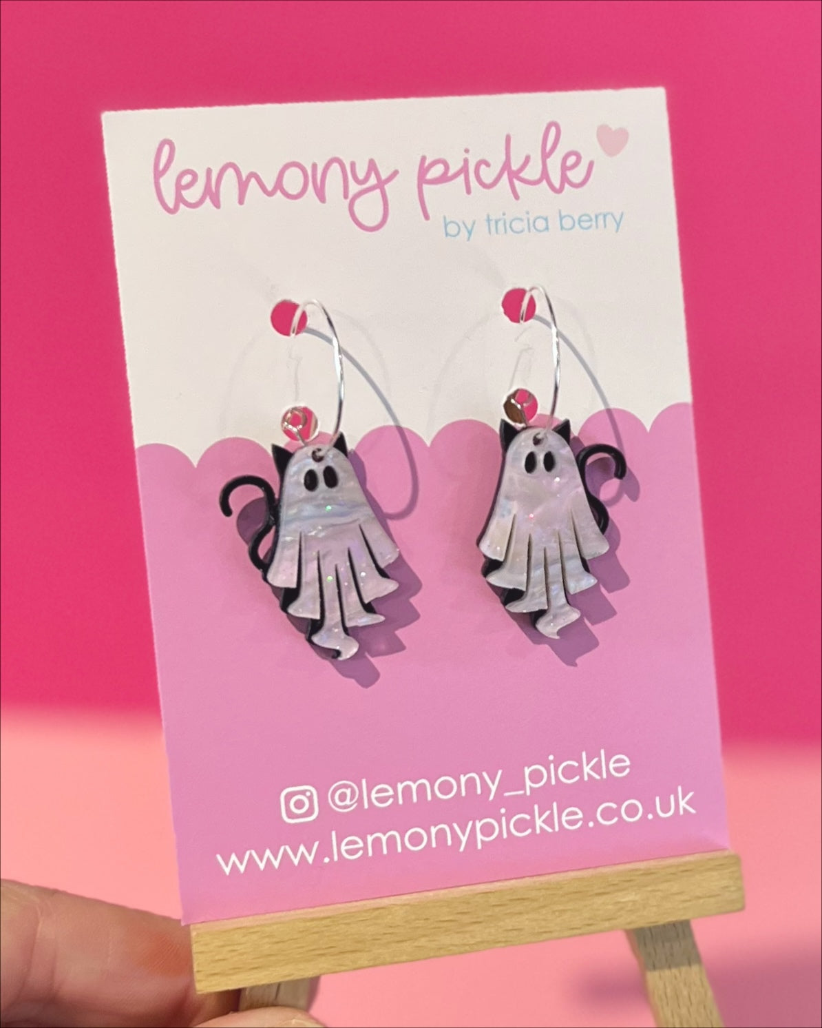Cute cats all dressed up for Halloween! Wearing a shimmering glittery pale pink ghost costume, these kitties are perfect for spooky season!