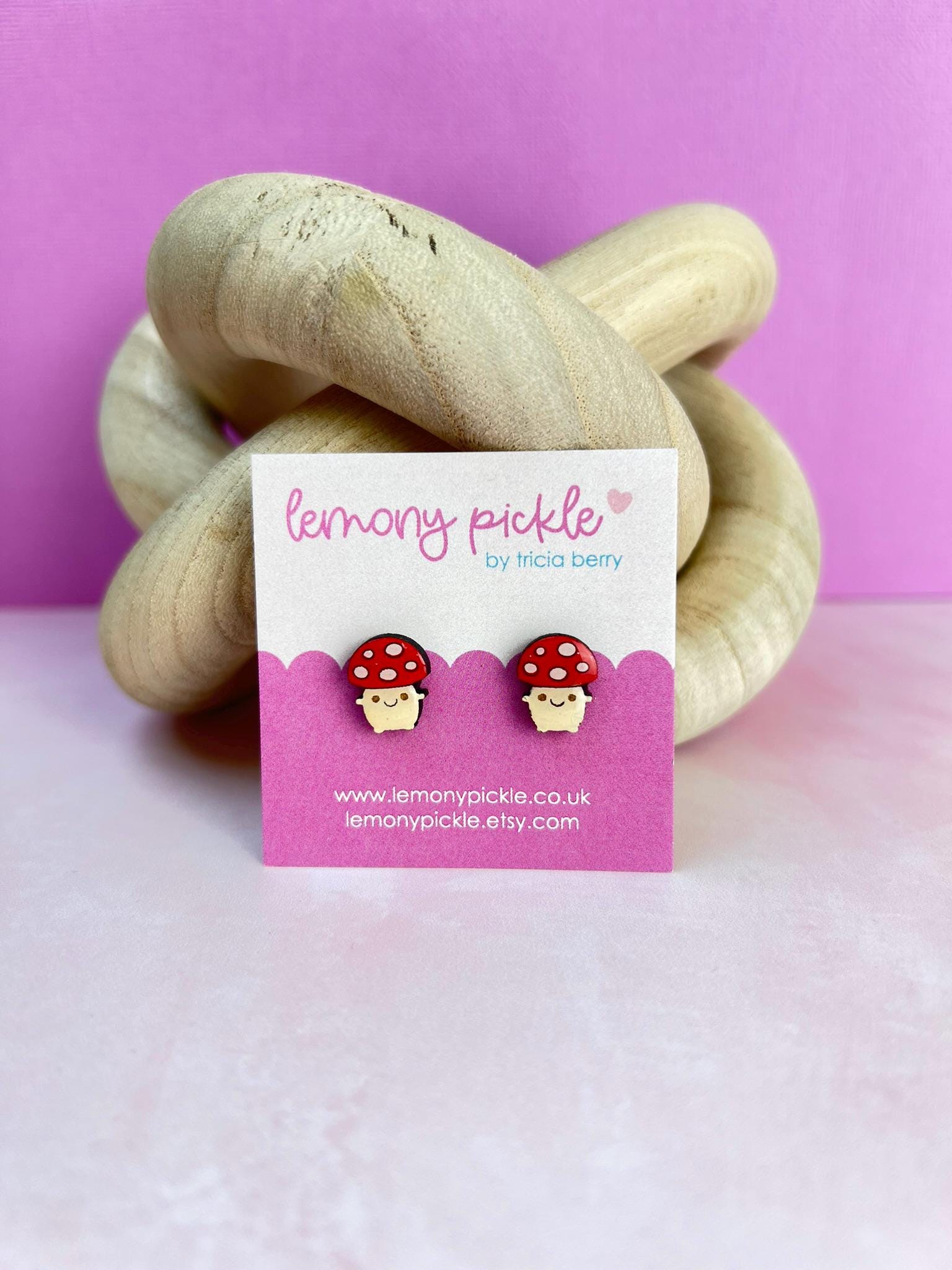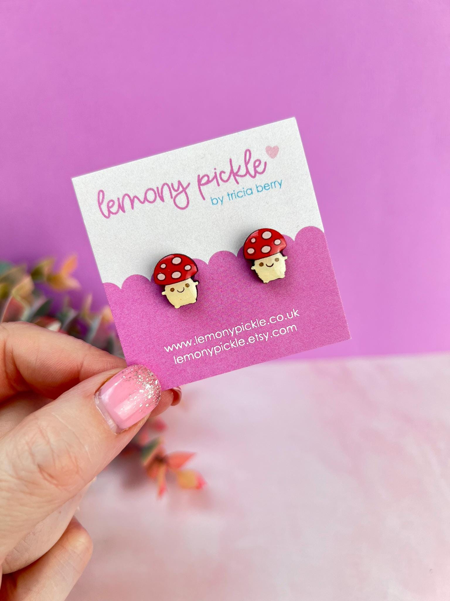 Product Features: Hand-painted wooden mushroom character earrings Lightweight stud style, perfect for all-day wear Hypoallergenic stainless steel studs, secure butterfly backing