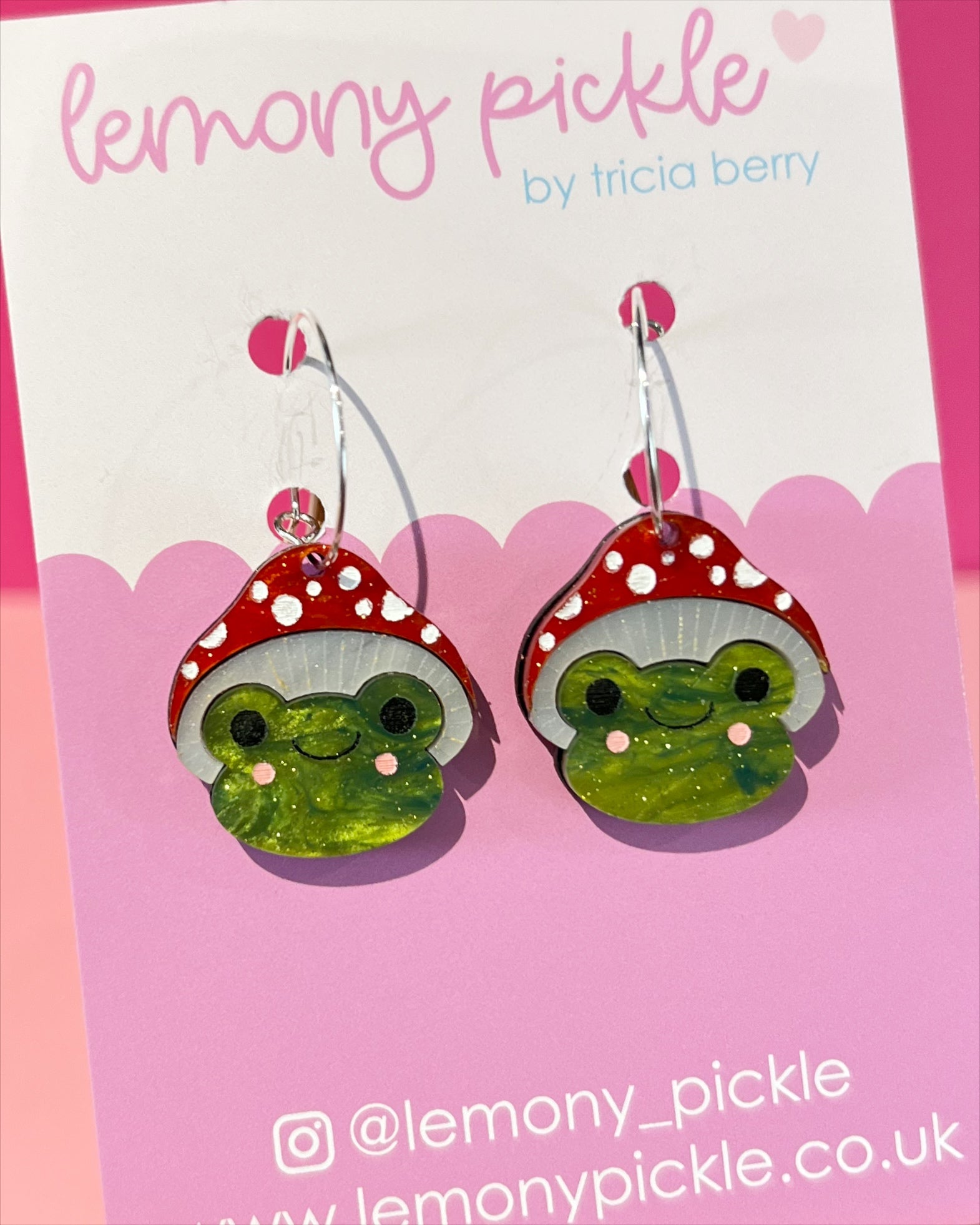 Cute frogs wearing tiny mushroom hats! Acrylic with handpainted details. Choose from hooks or hoops in the drop down box.